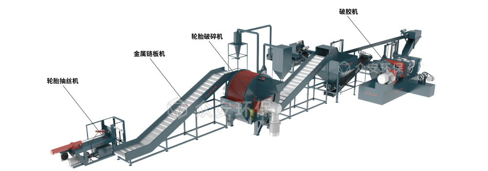 根据不同类型的轮胎定制化设计:喂料系统、破碎系统、筛分系统、钢丝分离系统、纤维分离系统、降尘系统整体方案设计,工艺先进、节能环保。