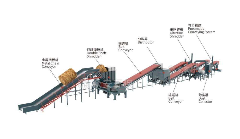 金属链板输送机或抓料机将生物质农林废弃物均匀喂入撕碎机,撕碎机经过剪切、撕裂、挤压的工作原理将物料进行破碎处置,破碎后的物料经皮带输送机输送至成品料区或转运到下一道处置工序,皮带机上设计磁选装置将金属物料选出。众安环保整套生产系统可以实现密闭输送、负压降尘、清洁生产。